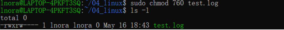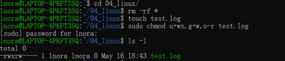 (13)进入到04_ubuntu目录下,删除当前目录下的所有文件和目录,新创建文件test.log,在默认权限的基础上,给test.log文件的所有者增加可写和可执行权限,给test.log文件的所属组增加可写权限,撤销test.log文件其他用户的可读权限,按照上述要求,分别使用字符和数字两种表达方式给test.log文件设置新权限。
