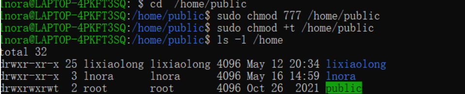 (17)创建公共目录/home/public,使得user1用户和user2用户都可以在/home/public目录下创建文件。给/home/public目录增加sticky权限。