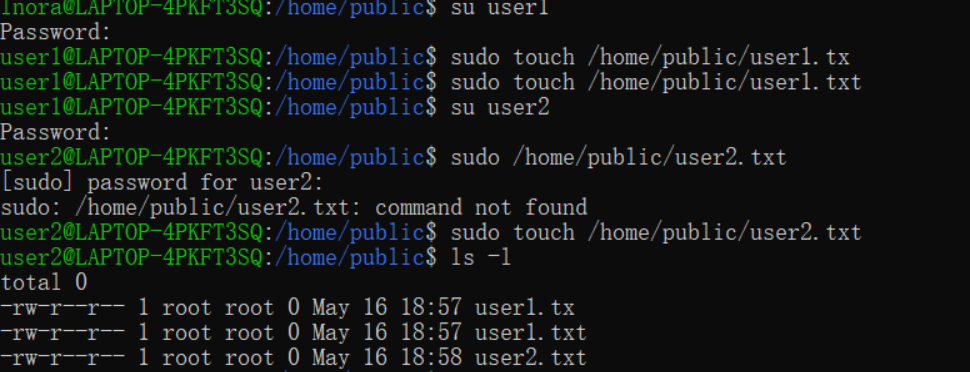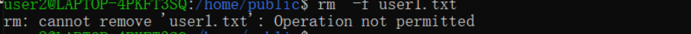 18)user1用户在/home/public目录下创建文件user1.txt,user2用户在/home/public目录下创建文件user2.txt。使用user2用户登陆,进入到/home/public目录下,尝试删除user1.txt文件,看能否成功?