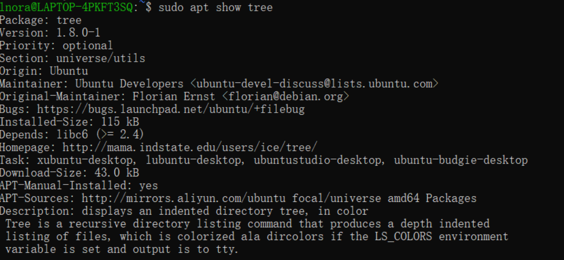 (21) 使用apt包管理命令查看tree命令对应软件包的详细信息。(show)