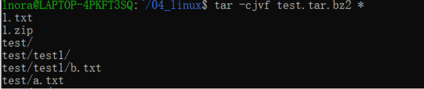 (7)在04_ubuntu目录下,使用tar命令打包并以bzip2格式压缩当前目录下的所有文件和目录,打包后的文件名为test.tar.bz2.