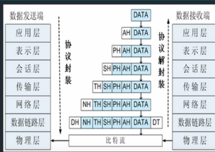 发送端每经过一层(物理层除外)都要在原数据上进行协议封装,即最前面加装一个本层所使用协议的协议头,接收端每经过一层都要对原数据进行协议解封装,即去掉原数据最前面的上层协议头。 - OSI/RM数据通信原理图