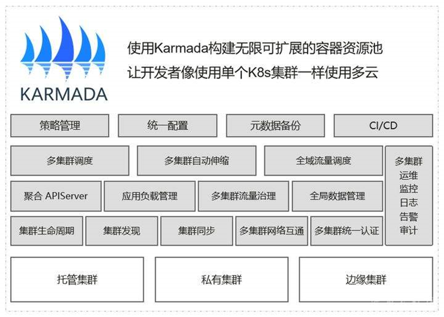 当时我们和华为交流到了多集群管理的一个现状以及痛点,包括对社区联邦类项目的讨论,我们双方也非常希望能够在这方面革新,下图为Karmada的功能视图: