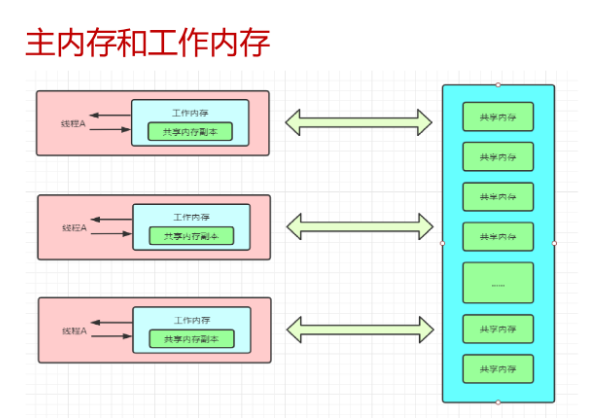 每条线程还有自己的工作内存,线程的工作内存中保存了该线程使用的变量的主内存副本,线程对变量的所有操作都必须在工作内存中进行,而不能直接读写主内存中的数据。不同的线程之间也无法直接访问对方工作内存中的变量,线程将变量值的传递均需要通过主内存来完成,线程、主内存、工作内存三者的交互关系如下图