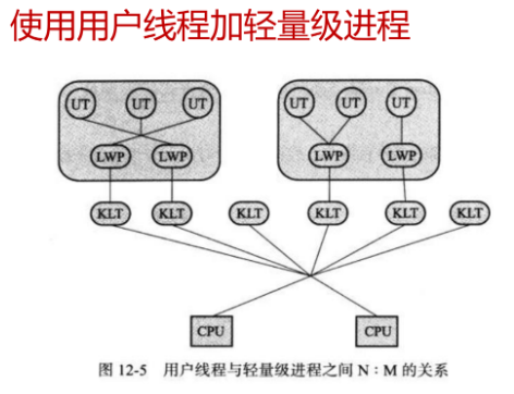 大大降低了整个进程被完全阻塞的方向,在这种混合模式中,用户线程与轻量级进程的数量比是不定的,是M:N的关系