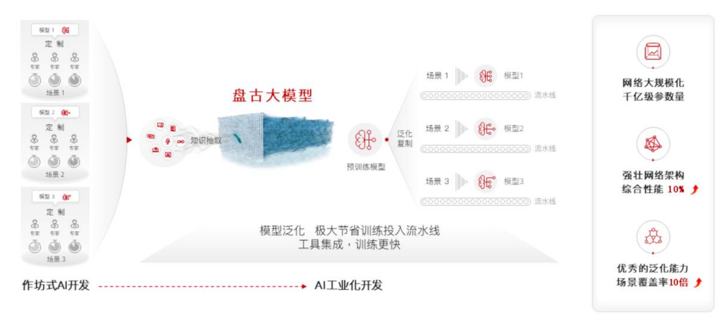 华为云盘古大模型可以实现一个AI大模型在众多场景通用、泛化和规模化复制,减少对数据标注的依赖。相对于以前的作坊式开发,AI工业化开发效率可以提升10~100倍,同时AI模型具备更佳的性能。