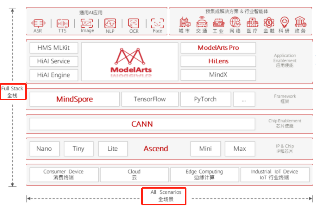 技术功能视角;指包括云底座、芯片(昇腾)、开发/训练/推理框架MindSpore和AI使能能力在内的全堆栈方案