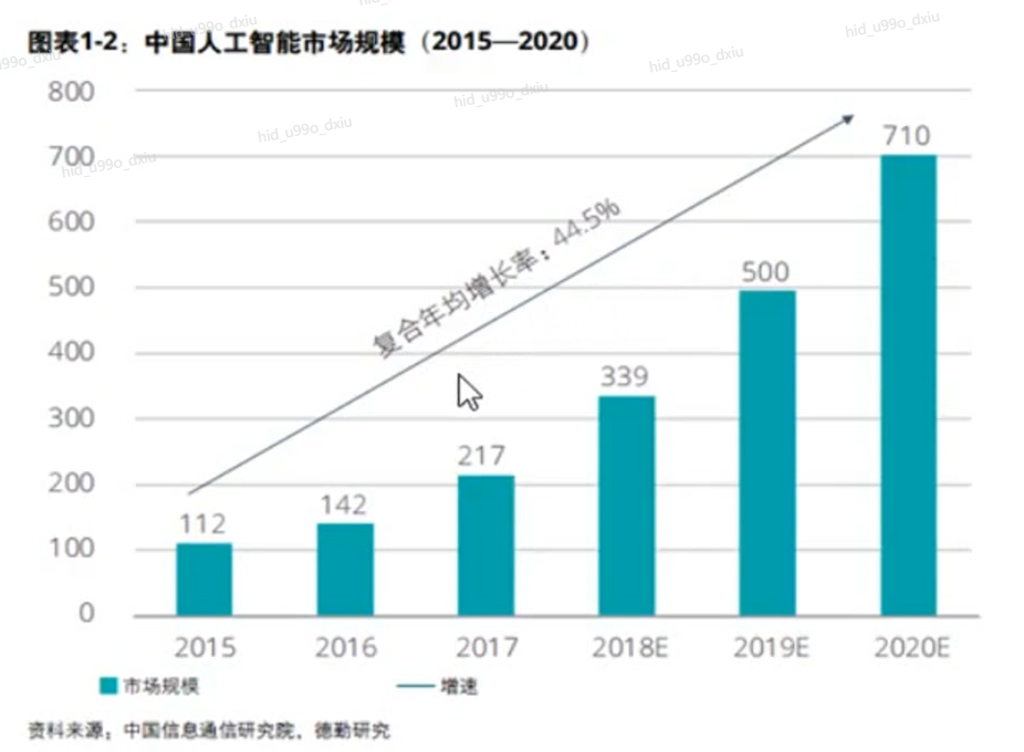 看下中国人工智能市场规模的增长,复合年均增长路44.5%,一路攀登。