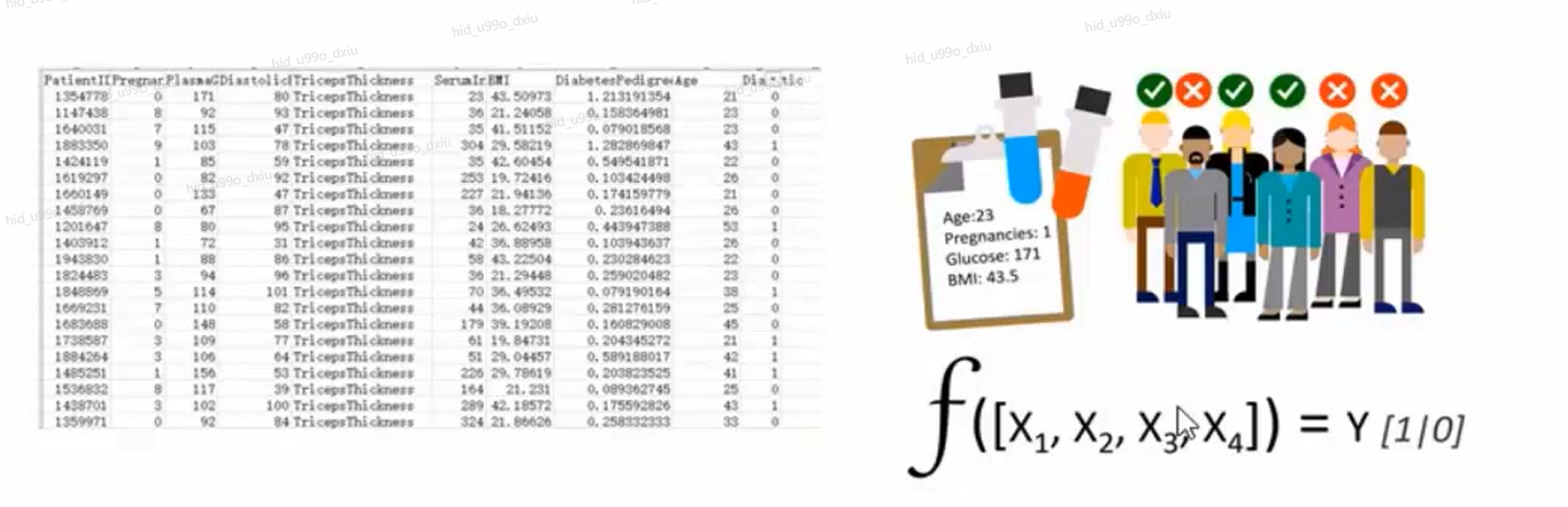 分类举例:假设有一家诊所,收集到患者的一些信息,例如血糖指数、心脏血压、年龄、身体质量指数等信息,井且已标注糖尿病患者和非糖尿病患者(1和0),利用数据训练一个模型来做预测。