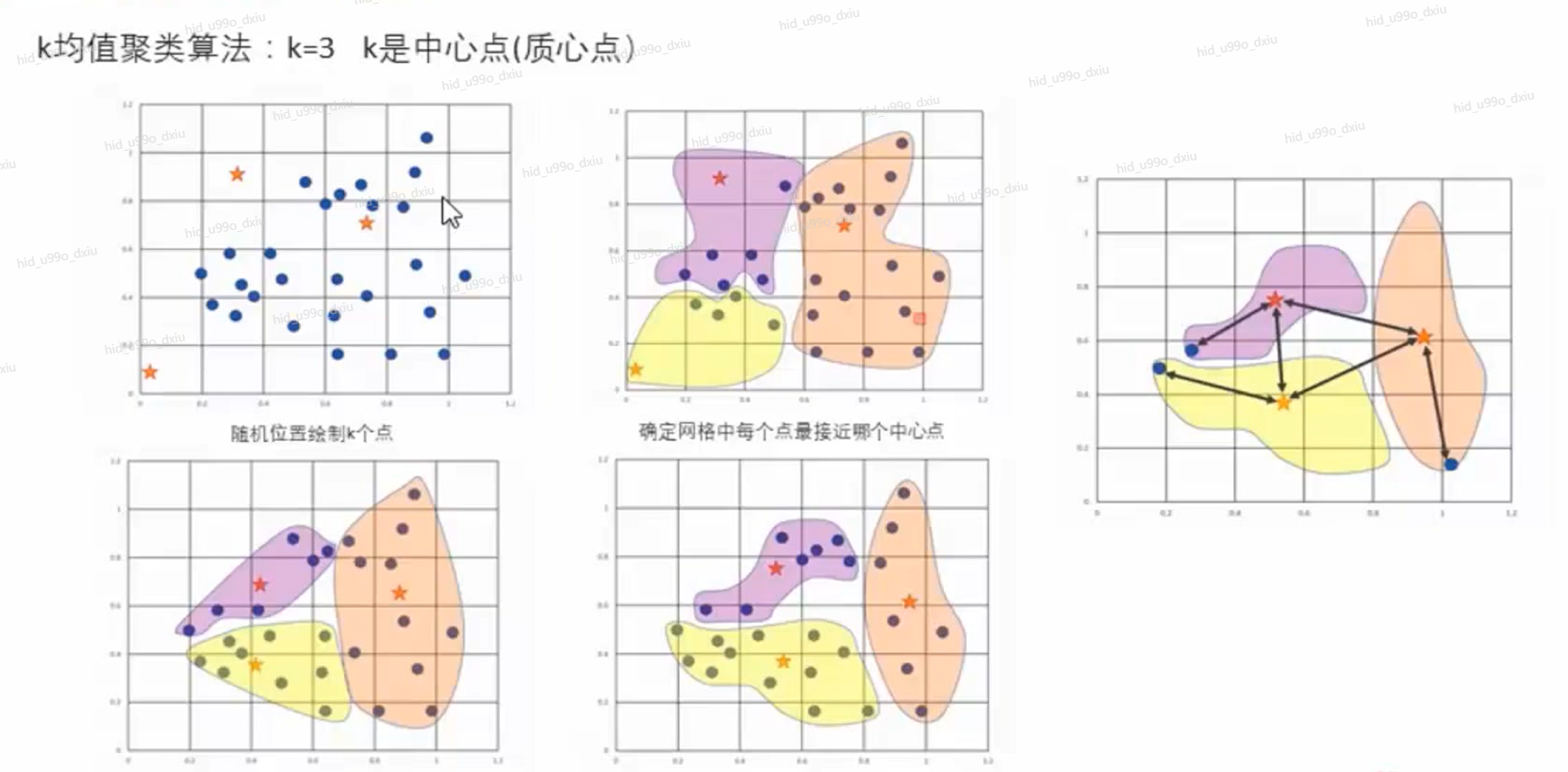 k均值聚类算法(k-means clustering algorithm)是一种迭代求解的聚类分析算法,其步骤是将数据分为K组,则随机选取K个对象作为初始的聚类中心,然后计算每个对象与各个种子聚类中心之间的距离,把每个对象分配给距离它最近的聚类中心。聚类中心以及分配给它们的对象就代表一个聚类。每分配一个样本,聚类的聚类中心会根据聚类中现有的对象被重新计算。这个过程将不断重复直到满足某个终止条件。终止条件可以是没有(或最小数目)对象被重新分配给不同的聚类,没有(或最小数目)聚类中心再发生变化,误差平方和局部最小。