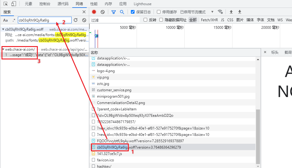 在网络视图页面,唤醒搜索框,搜索字体文件名,发现其在 2 个请求中出现。第一个是字体文件,第二个是我们上文请求的数据接口。