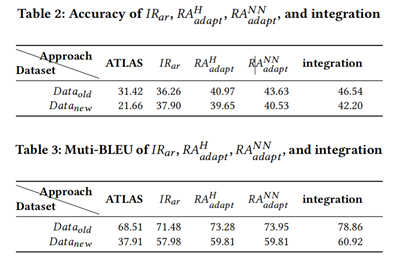 表2和表3的第三列展示了IRar方法在两个数据集上的准确率和BLEU值,从表中可以看到在两个数据集上,IRar方法在准确率和BLEU值上的表现都要明显优于ATLAS。