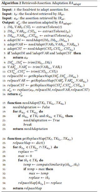 本章节介绍本文提出的基于IR的方法(包括基础的信息检索技术IRar以及自动适配技术RAadapt)和结合的方法。图1展示了本文提出的方法的整体流程图。给定一个Focal-test方法,本文首先通过IRar技术到训练集中检索最相似的Focal-test方法,并将其对应的assertion作为检索到的assertion返回。接着本文提出自动适配技术RAadapt,RAadapt技术包括两个适配策略:基于启发式搜索(RAadaptH)的适配和基于神经网络(RAadaptNN)的适配。最后本文基于相容模型提出一个结合的方法,来智能的选择应用适配完之后生成的assertion还是应用基于深度学习方法(ATLAS)生成的assertion。文本方法部分的详细介绍请参见本文发表在国际软件工程会议的论文[1]。