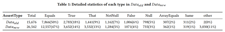 实际上ATLAS使用的Datasetold数据集是去掉了有挑战性的数据,进而简化了断言生成任务的评估。因此本文进一步通过将ATLAS去掉的数据加回到数据集中来构造一个更有挑战性的数据集,本文将该数据集记为Datasetnew。最终Datasetold包含265,420条数据,并以8:1:1划分训练集、验证集和测试集。