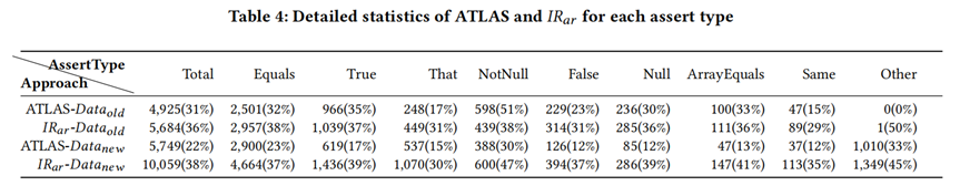 为了进一步研究ATLAS和IRar生成的assertion,我们首先分析ATLAS和IRar成功生成的assertion。