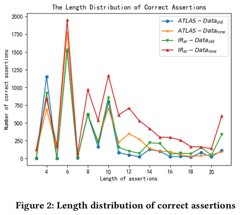 图2展示了ATLAS和IRar成功生成的断言语句的平均长度。从图中可以看出,在生成长的断言语句时,IRar比ATLAS效果更好。本文统计发现,在Datasetold数据集上,ATLAS和IRar成功生成的断言语句的长度平均分别为7.98和8.63,在Datasetnew数据集上,ATLAS和IRar成功生成的断言语句的长度平均分别为9.74和10.74。