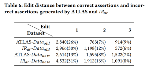 表6展示了ATLAS和IRar不能成功生成的断言距离标注断言的编辑距离。从表中可以看到,约40%-50%不能成功生成的断言可以在修改三个token的情况下将其改对。