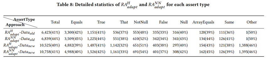 表8展示了RAadaptH和RAadaptNN在不同断言类型的准确率,实验结果表明RAadaptH和RAadaptNN在不同断言类型上的准确率都高于ATLAS,同时RAadaptNN可以达到最高的准确率。