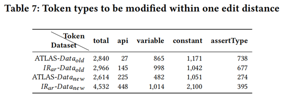 表7展示了当编辑距离为1时,该token的类别。从表中可看到,常量是最需要开发者主要修改的地方。