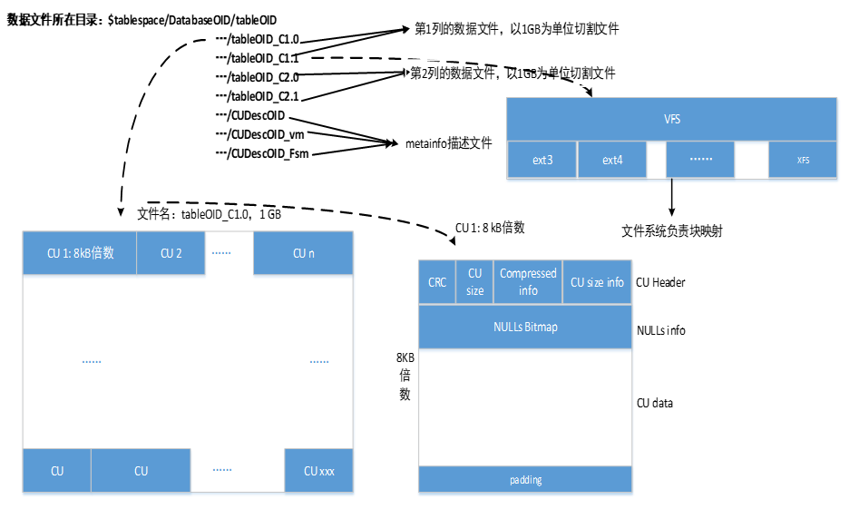 从下图中可知,列存表的最小存储单元是CU(Compress Unit),每个CU的大小为8KB的整数倍(需要注意的是,CU并不是由页组成的,它是一个独立的存储单元),最多存储1列60000行数据。同一列的多个CU连续存放在一个数据文件中,当数据文件的大小超过1G,会自动切换到新的文件中。