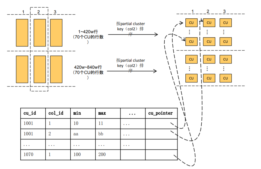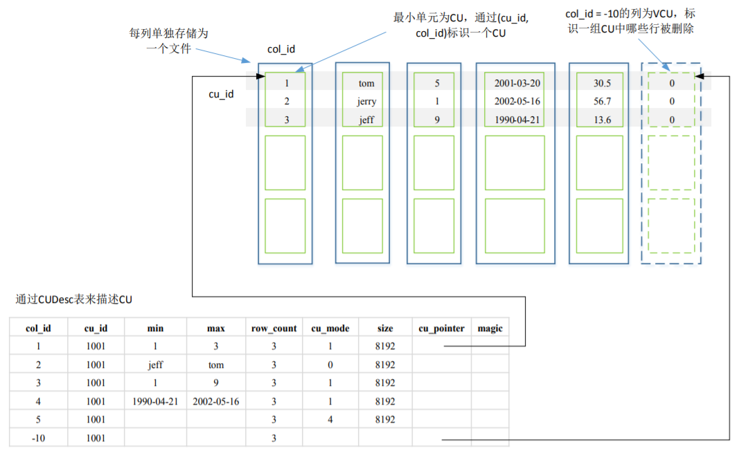 除此之外,每个列存表还有一个记录CU的辅助和管理信息的行存表CUDesc表,该表中的每一行记录对应一个CU,包括最大值/最小值、数据条数,以及CU在文件中的偏移量及大小。其中,col_id=-10的行为VCU, cu_pointer记录这一组CU(cu_id相同)中哪些行被删除。另外,CU的可见性也是通过CUDesc的可见性来决定的。