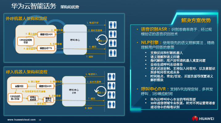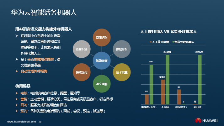 华为云智能话务机器人解决方案优势体现在以下三个方面:语音识别ASR,NLP引擎,呼叫中心IVR。此外,它还可以精确理解对话意图和信息。用AI语音语义能力构建外呼机器人:在呼叫中心系统中加入语音识别、自然语言处理和语义理解等技术,让机器人智能外呼代替人工;基于垂直领域知识图谱,语义理解更准确;自动生成外呼报告。外呼机器人的使用场景:电核、营销、回访、预约等。电核:电话核实客户信息,提醒,通知等。营销:主动营销,精准分类,筛选意向或高质量客户,锁定目标。回访:服务完成后的调查和回访。预约:各种类型的电话预约(面试,会议,预定,派送等)。