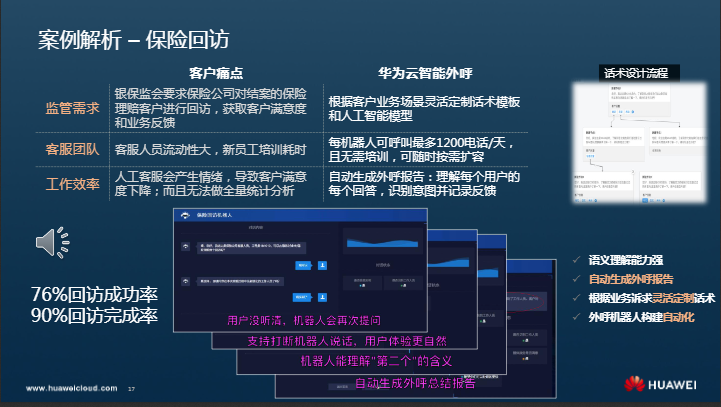 接下来,我们来看一个案例解析-保险回访。对于监管需求,传统的保险回访,银保监会要求保险公司对结案的保险理赔客户进行回访,获取客户满意度和业务反馈。而华为云智慧外呼会根据业务场景灵活定制话术模板和人工智能模型。对于客服团队,传统的保险回访客服人员流动性大,新员工培训耗时。而华为云智慧外呼中每机器人可呼叫最多1200电话/天,且无需培训,可随时按需扩容。对于工作效率,传统的保险回访人工客服会产生情绪,导致客户满意度下降,而且无法做全量统计分析。而华为云智慧外呼自动生成外呼报告:理解每个用户的每个回答,识别意图并记录反馈。