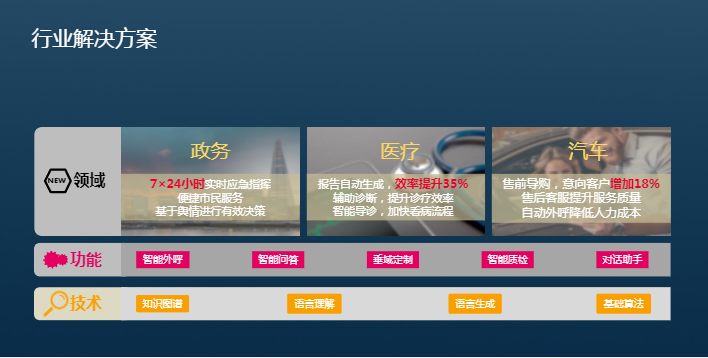 我们来简单介绍下华为云对话机器人在政务、医疗、汽车等行业领域的解决方案。如智能政务,一网通办:个性化、主动化、精细化;智慧医疗,虚拟助手,智能电子病案;汽车行业,智能引导、售后服务、智能外呼。