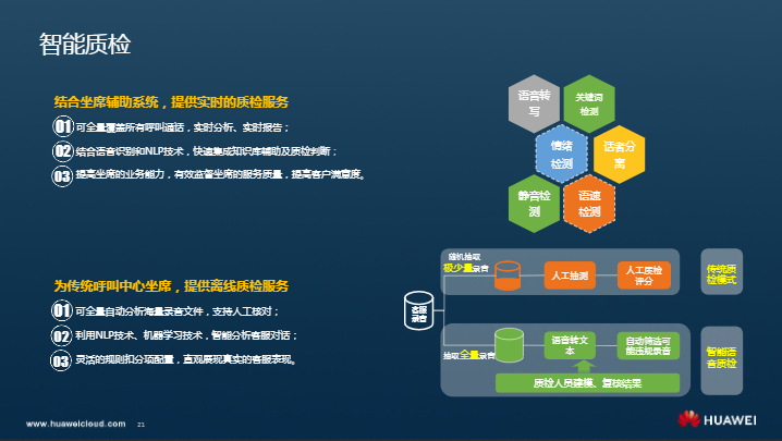 华为云智能质服务是使用自然语言算法和预定义规则去分析呼叫中心坐席客服与客户之间的对话。结合坐席辅助系统,提供实时的质检服务。同时,也为传统呼叫中心坐席,提供离线质检服务。