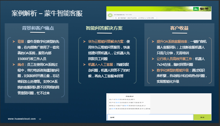 然后,我们来一起看一些使用的示例。如汽车领域知识库自动构建示例(QA挖掘),智能问答接入内部IT、差旅、采购、公有云等14个热线,蒙牛智能客服。