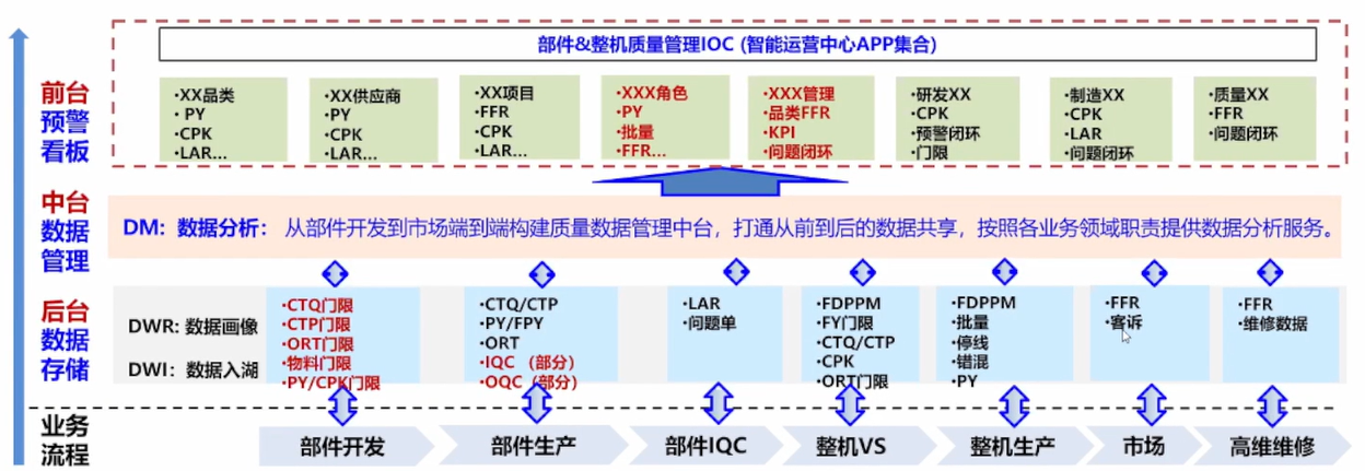 - 后台:各业务领域根据自己业务需求进行数据建模分析全流程数据,并管理预警问题闭环,最终通过前台实现业务管理IT化。
