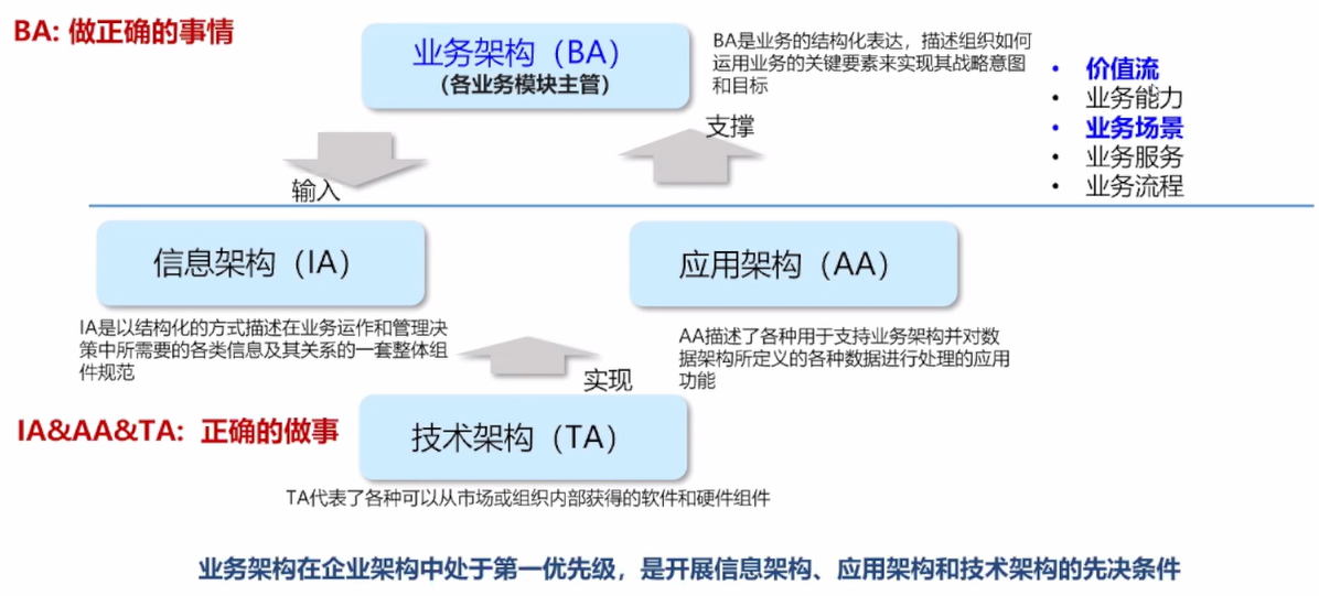 业务架构在企业架构中处于第一优先级,是展开信息架构,应用架构和技术架构的先决条件。