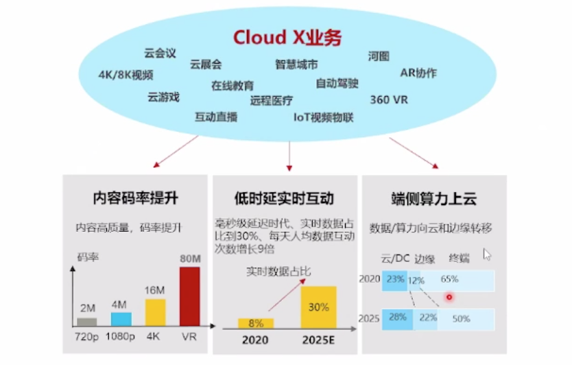 当前,很多云上业务产品都在面临着三大挑战,首先是内容码率的提升,为了提升用户体验,需要提升对应的视频画面质量,之前720P的视频画面要求2M左右的网络带宽,1080P的视频画面要求4M左右的网络带宽。随着4K和VR业务场景的需要,对网络带宽和视频码率都提出了更高的要求,比如VR场景要求每秒80M的网络带宽,之前720P视频画面的带宽的40倍。其次是低时延实时互动,现在已经进入到毫秒级延时时代,实时互动数据占比预计到2025年,将从2020年的8%上升到30%,超低延时的实时互动应用场景将成为未来社会的主流。还有就是伴随而来的端侧算力上云,由于数据量的激增,数据和算力逐步向云和边缘计算转移。预计到2025年,终端模块的数据和算力将由2020年的65%下降到50%,相应的云端和边缘计算将分别上升5%和10%。