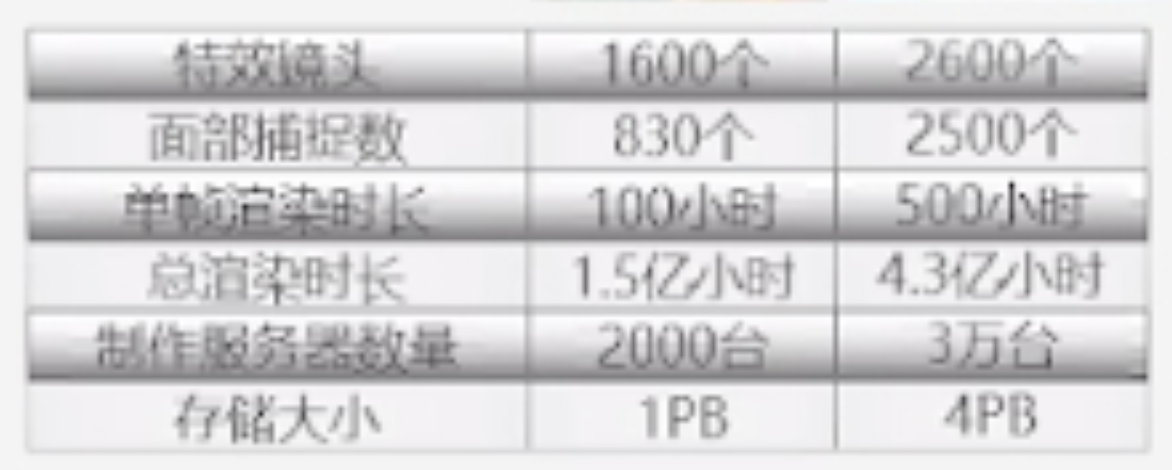 内容质量升级,算力诉求激增,传统工作站模式已经无法满足日益增加的需求。举一个例子,2009年上映的《阿凡达》的特效镜头是1600个,到了2019年上映的《阿丽塔》的特效镜头是2600个;前者的面部捕捉数是830个,后者的面部捕捉数是2500个;前者的单帧渲染时长是100小时,后者的单帧渲染时长是500小时;前者的总渲染时长是1.5亿个小时,后者的总渲染时长是4.3亿个小时;前者使用的制作服务器数量是2000台,后者使用的制作服务器数量是30000台;前者的存储大小是1PB,后者的存储大小是4PB。以上数据足以说明内容数据量激增的现实趋势。