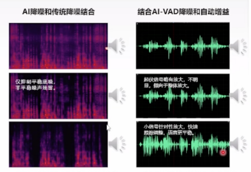 另外,音频自研算法深度配合,打造高可靠的音频体验。通过传统和AI回声算法结合,能够保证双讲场景不漏回声、不丢字,能够适应稳态环境,又能快速适应外部环境变化,快速收敛,支持更低信回比场景的回声抑制。另外,传统降噪和AI降噪结合可以同时抑制平稳和非平稳噪声,解决噪声收敛慢等问题,噪声抑制后相对传统降噪残留更少。结合AI-VAD降噪和自动增益精确人声检测,实现更好的降噪和自动增益效果,处理后信号更平稳,小信号响应更快更准确。