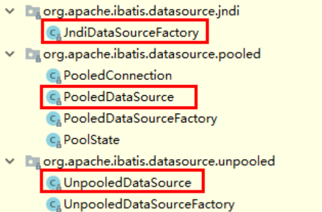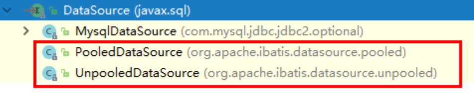 其中 UNPOOLED ,POOLED 数据源实现了 javax.sq.DataSource 接口, JNDI 和前面两个实现方式不同,了解即可。