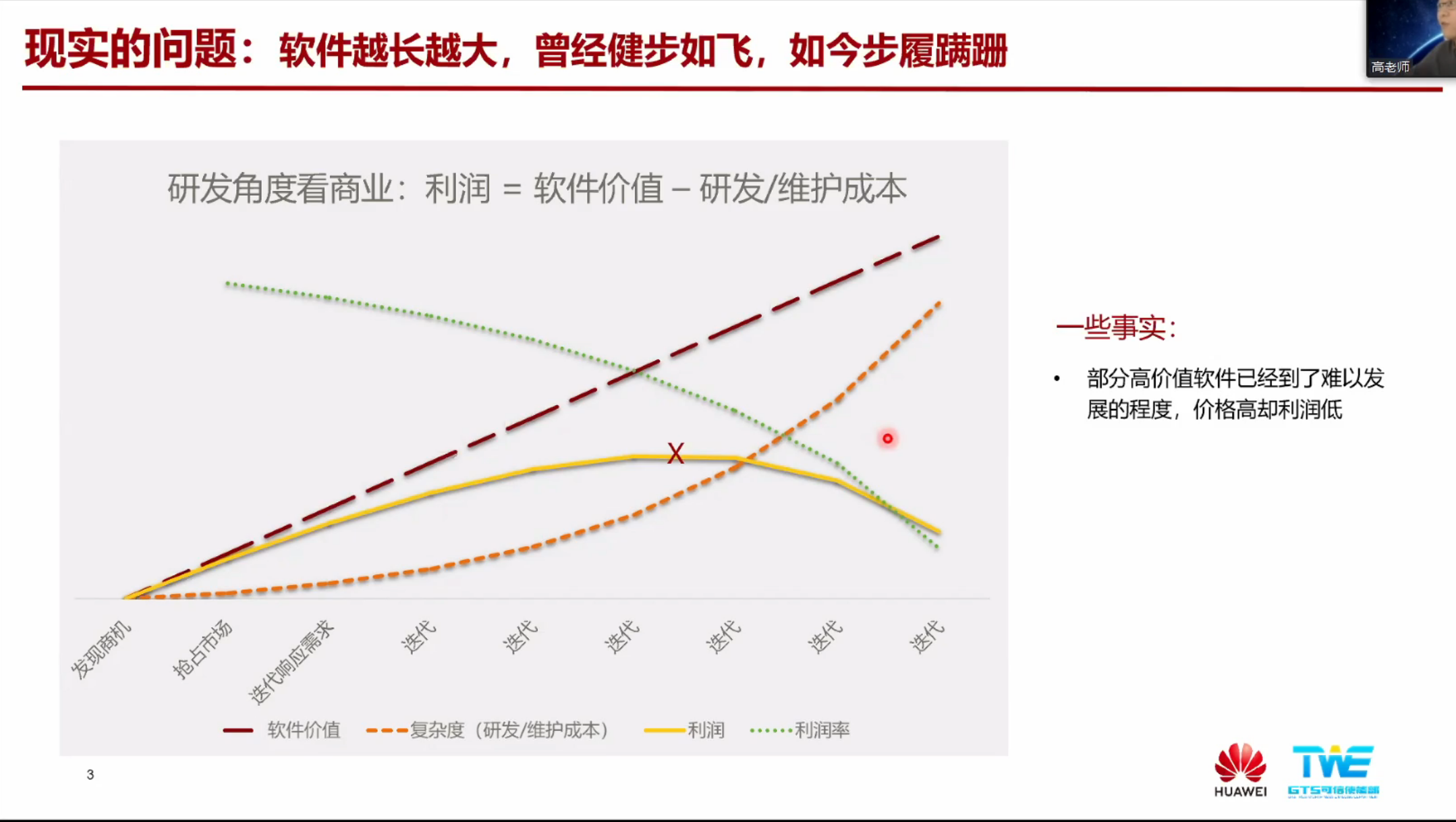 从商业的角度看软件研发,利润大概可以表示为软件价值减去研发和维护成本。以下图为例,在发现商机的初始阶段,软件价值为零,而随着软件版本的迭代,其价值呈线性增长。与此同时,软件的复杂度也呈曲线上涨,那么随之带来的就是利润的下滑。