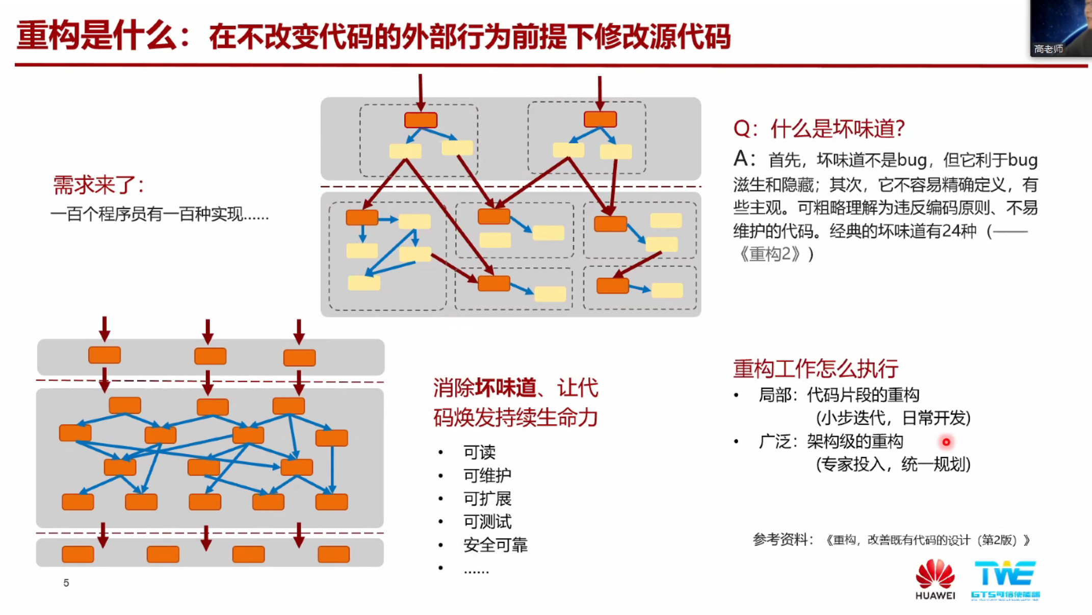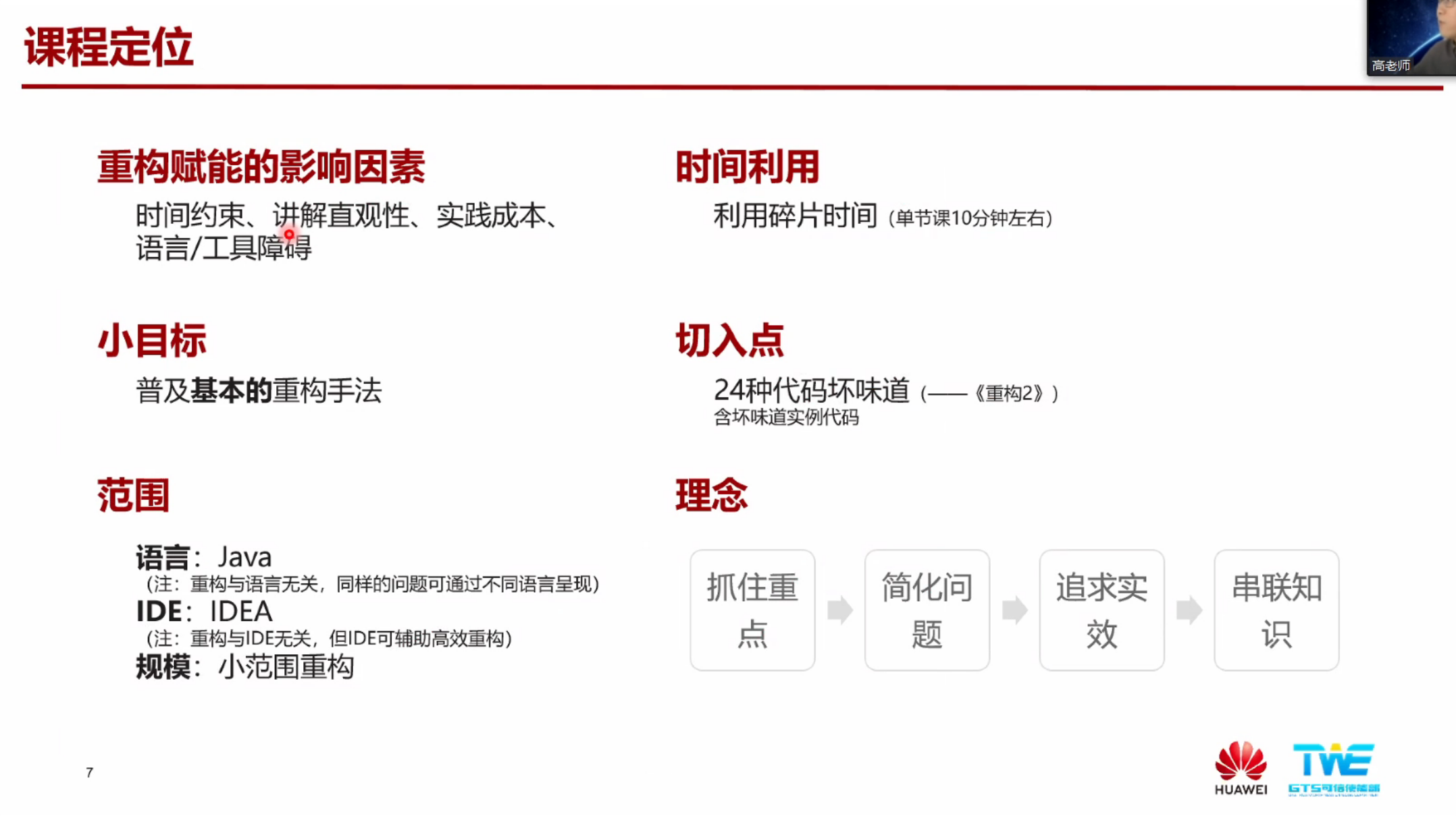 华为主营电信业务,其对代码质量的要求是非常高的,华为的代码规模以10亿级计算,以此为背景,华为公司内部孵化了此代码重构课程。