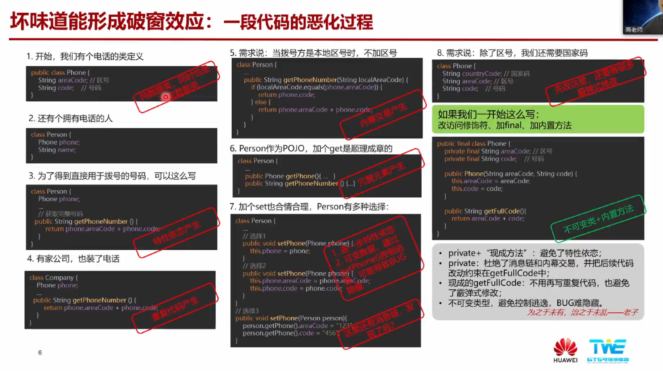 而如果我们的代码一开始是如最后一个小图所示,改访问修饰符、加final、加内置方法,那么就可以避免上述的特性依恋,杜绝了消息链和内幕交易,较少了重复代码以及避免了控制逃逸问题。