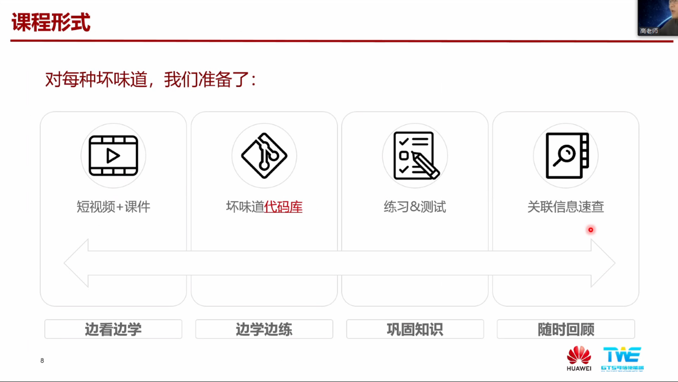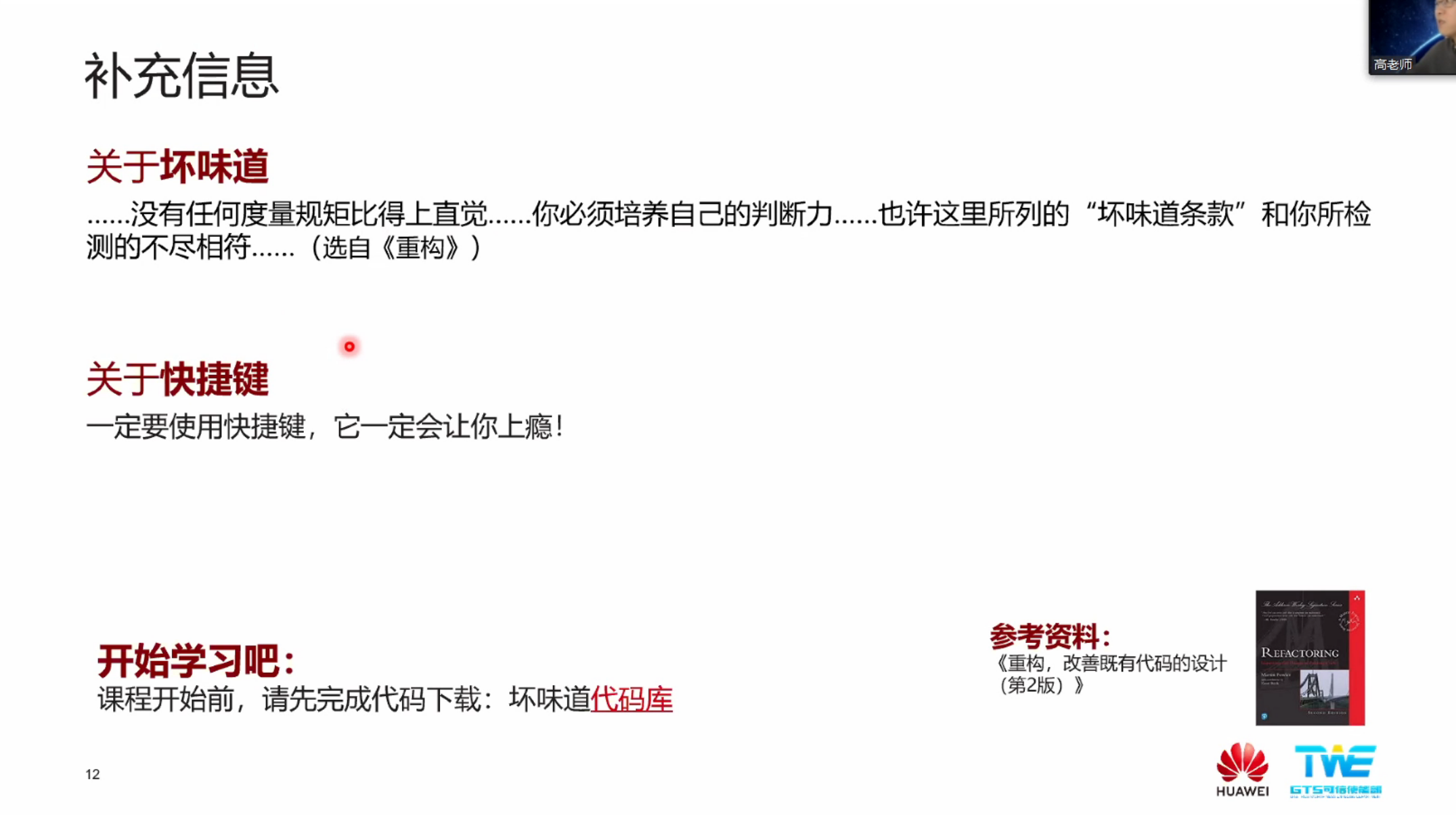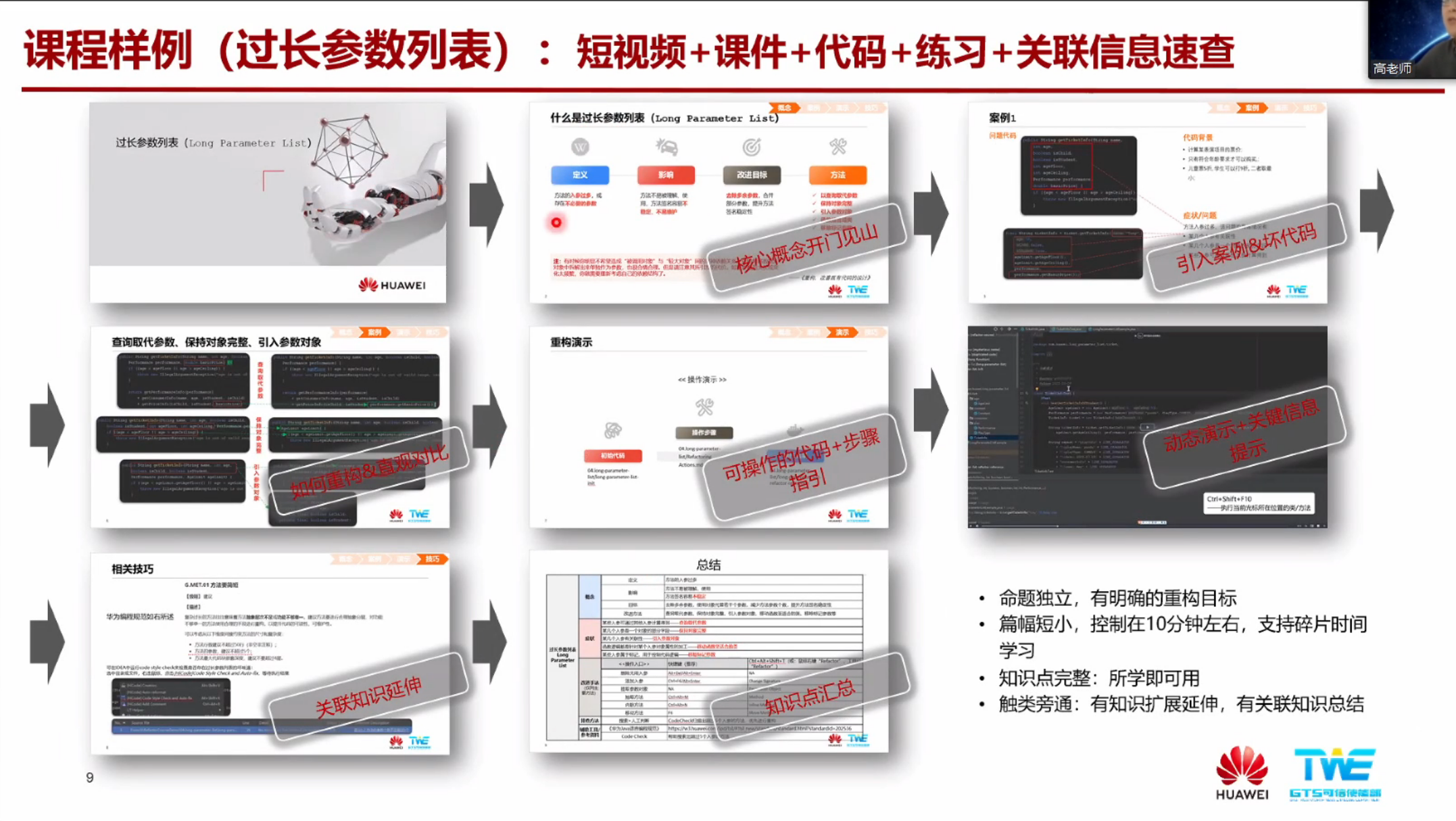 针对每种坏味道,老师们精心准备了短视频和课件、坏味道代码库、练习与测试题目以及关联信息速查技能。