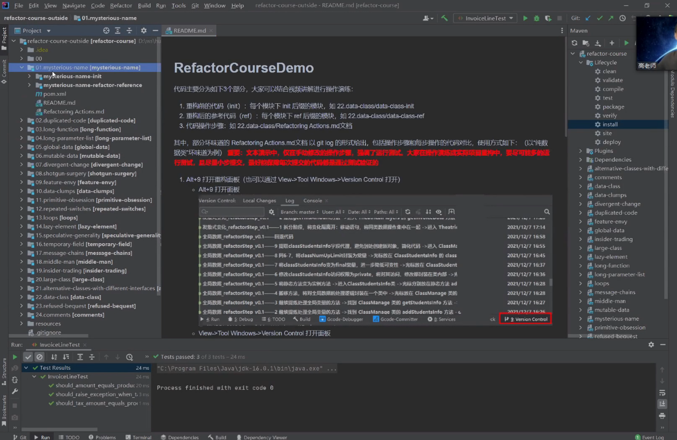 以01.mysterious-name为例,其中包括三个部分,mysterious-name-init表示重构之前含有坏味道代码的项目,mysterious-name-refactor-reference表示重构后的代码,而Refactoring Actions.md表示重构的过程。