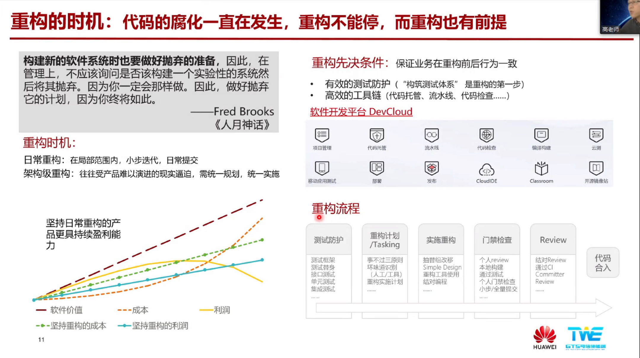 但是,重构也是有一定的先决条件的,重构需要保证业务在重构前后行为一致。也就是需要有有效的测试防护和高效的工具链,比如代码托管、流水线以及代码检查等,更多也可参考华为云软件开发平台DevCloud。
