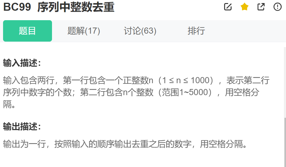 原题链接:序列中整数去重_牛客题霸_牛客网