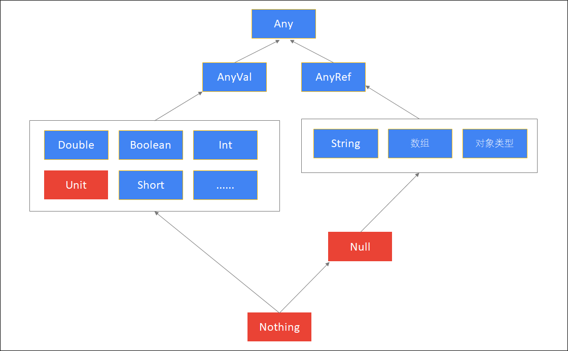 | Nothing | 所有类型的子类不能直接创建该类型实例,某个方法抛出异常时,返回的就是Nothing类型,因为Nothing是所有类的子类,那么它可以赋值为任何类型 |