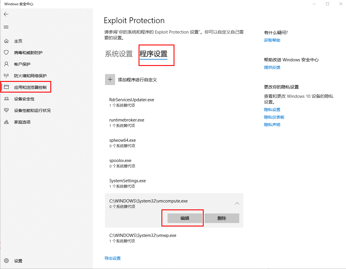 打开windows安全中心-应用和浏览器控制-程序设置