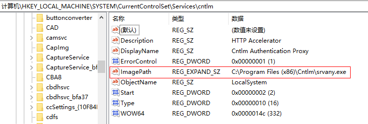 ImagePath:C:\Program Files (x86)\Cntlm\srvany.exe