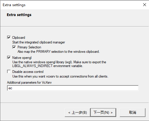- 启动后选择显示方式,下一步到Extra settings添加 -ac参数