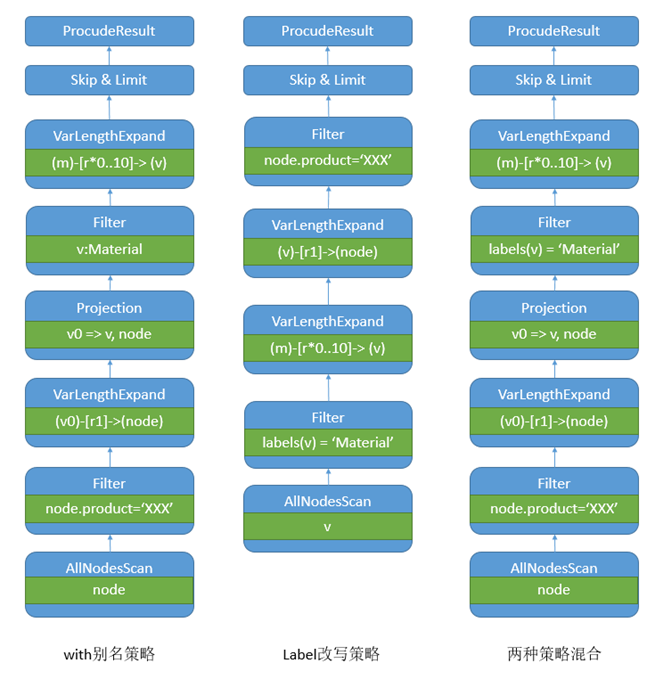 既然分析清楚了原因,那么只要通过改写cypher语句,让GES的cypher不优先通过v:Material做计划即可。这里用到下列两类策略: