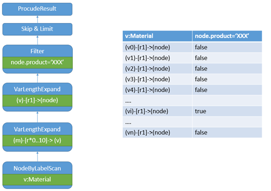可以看到,查询语句的执行和预期有差异。查询语句优先执行了一个Label扫描算子(NodeByLabelScan),对扫描到的每个点按入边方向进行了[r*0..10]这样的10跳操作,而后再从出边方向做了一跳并过滤,这就导致了最坏情况下,需要全图Label为Material的点都跳完10跳,才能拿到一条结果。如上图表格所示,在遍历到第一个满足条件的(vi)之前,已经对(v0)到(vi)这些点都做了10跳。即使语句末尾写了limit 1,因为始终遍历不到合适的数据,导致了后台的计算引擎一直在做计算。