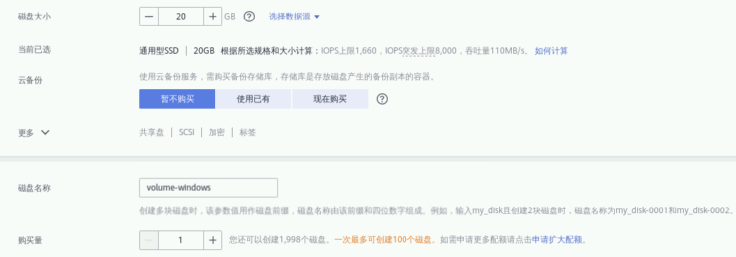 ④【磁盘规格】:通用型SSD(若无此规格,可选界面存在的规格)